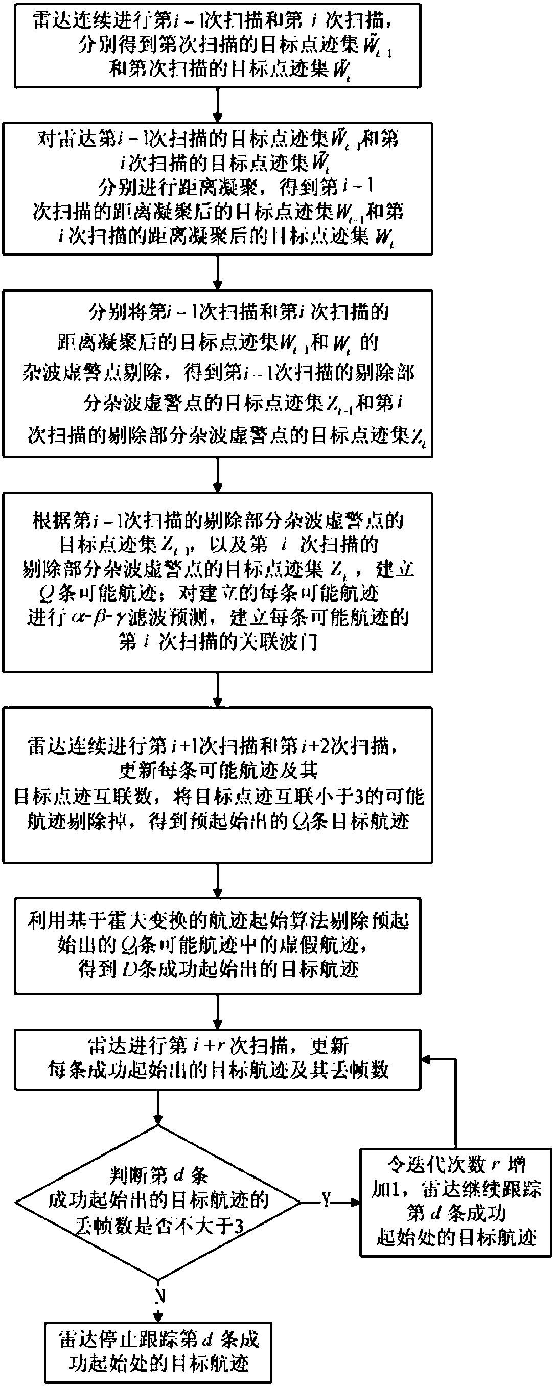 - 项目简介 本发明公开了一种基于多普勒信息的雷达对低空慢速小目标的跟踪方法,包括以下步骤:(1)分别对雷达第i‑1次和第i次扫描的目标点迹集进行距离凝聚,并分别剔除其中的杂波虚警点;(2)根据第i‑1次和第i次扫描的剔除杂波虚警点的目标点迹集,建立Q条可能航迹;雷达连续进行第i+1次和第i+2次扫描,更新每条可能航迹及其目标点迹互联数,将目标点迹互联数小于3的可能航迹剔除,再剔除可能航迹中的虚假航迹,得到D条成功起始出的目标航迹;(3)雷达进行第i+r次扫描,更新每条成功起始出的目标航迹及其丢帧数,若成功起始出的目标航迹的丢帧数不大于3,令迭代次数r增加1,雷达继续跟踪该成功起始出的目标航迹,反之,雷达停止跟踪该成功起始出的目标航迹。