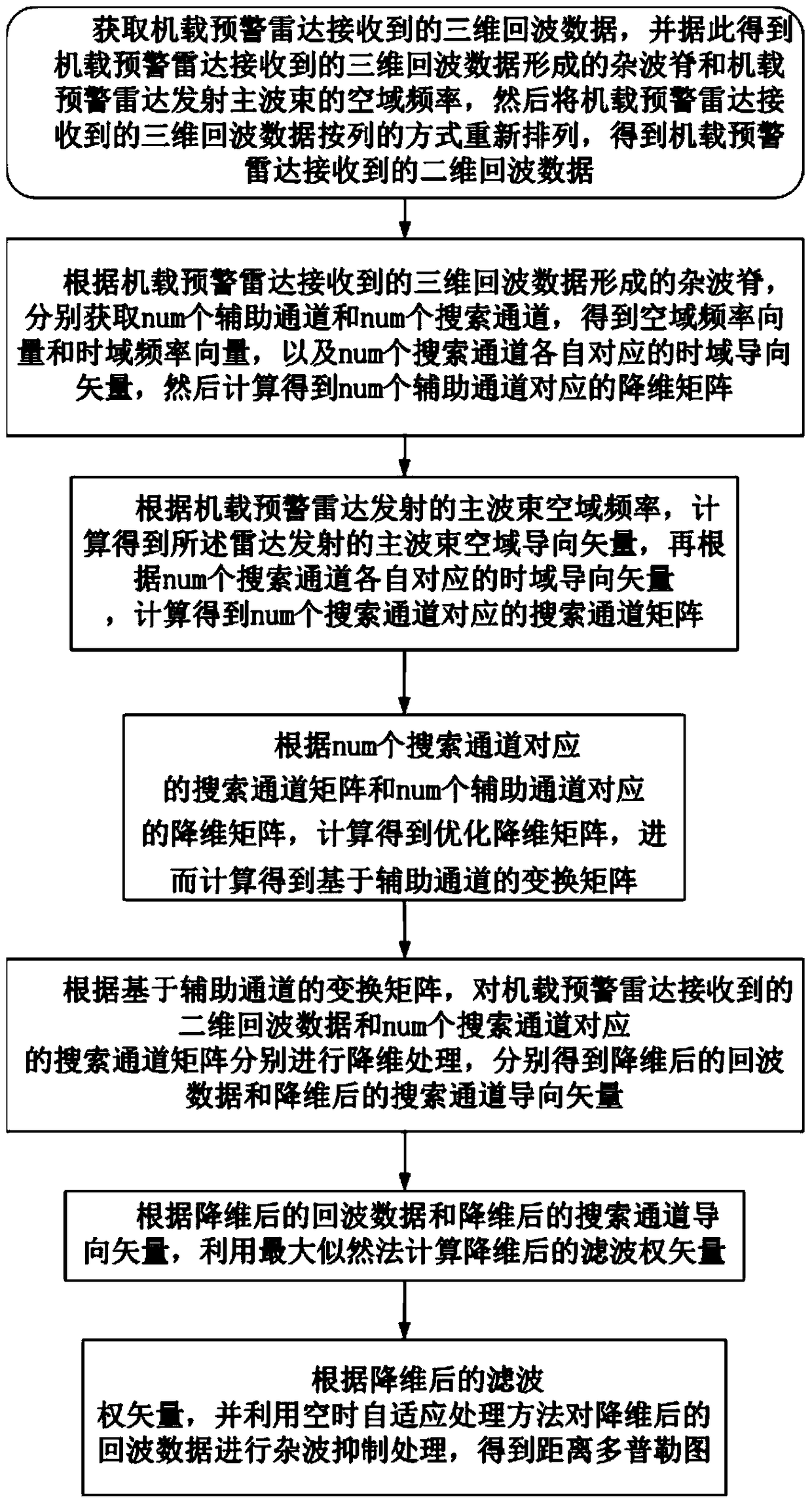 - 项目简介 本发明公开了一种基于辅助通道的机载预警雷达杂波抑制方法,其思路为:获取机载预警雷达接收到的三维回波数据,并据此得到所述三维回波数据的杂波脊,进而得到二维回波数据;再根据三维回波数据的杂波脊,分别获取num个辅助通道和num个搜索通道,得到num个辅助通道对应的空域频率向量和num个辅助通道对应的时域频率向量,进而依次得到num个辅助通道对应的降维矩阵和num个搜索通道对应的矩阵,并据此得到优化辅助通道的降维矩阵和基于辅助通道的变换矩阵;对所述二维回波数据和num个搜索通道对应的矩阵分别进行降维处理,得到降维后的回波数据和降维后的搜索通道导向矢量,进而得到降维后的滤波矢量,并据此对num个搜索通道的矩阵进行杂波抑制处理,得到距离多普勒图。