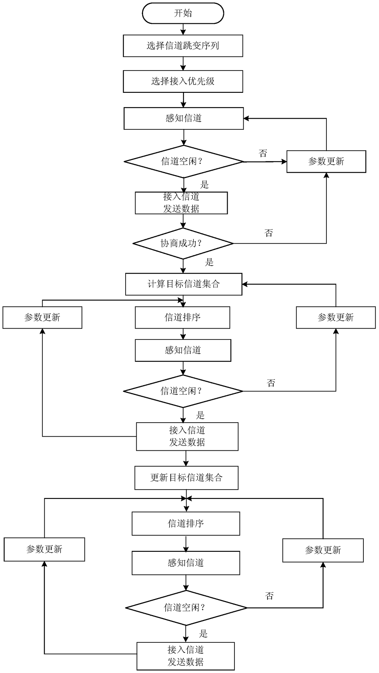 - 项目简介 本发明公开了一种基于信道跳变的分布式多信道握手方法,主要解决现有方法频谱利用率和公平性低的问题。其实现步骤是:1)在协商阶段,所有的认知用户按照信道跳变序列进行协商;2)协商成功的认知用户对计算可用于数据传输的目标信道集合O;3)协商成功的认知用户对使用置信上限UCB1算法进行数据传输;4)在数据传输阶段,更新目标信道集合O,协商成功的认知用户对使用置信上限UCB1算法进行数据传输;5)没有协商成功的认知用户对等待下一个周期的协商阶段继续协商。本发明经过接入优先级和通信阶段的周期性循环,使系统性能达到最优,提高了频谱利用率和公平性,可用于认知无线电网络中。