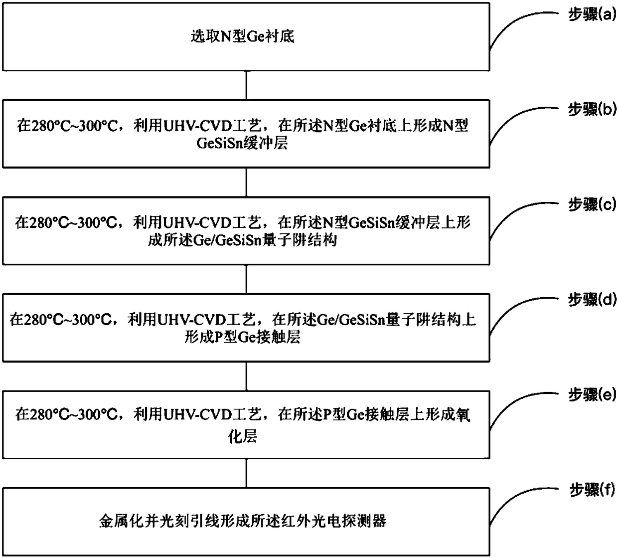 - 项目简介 本发明涉及一种探测范围可调的IV族红外光电探测器及其制备方法。所述制备方法包括步骤:(a)选取N型Ge衬底;(b)在280℃~300℃,利用UHV‑CVD工艺,在所述N型Ge衬底上形成N型GeSiSn缓冲层;(c)在280℃~300℃,利用UHV‑CVD工艺,在所述N型GeSiSn缓冲层上形成所述Ge/GeSiSn量子阱结构;(d)在280℃~300℃,利用UHV‑CVD工艺,在所述Ge/GeSiSn量子阱结构上形成P型Ge接触层;(e)在280℃~300℃,利用UHV‑CVD工艺,在所述P型Ge接触层上形成SiO2层;(f)金属化并光刻引线形成所述红外光电探测器。本发明实施例制备并提供探测范围可调的IV族红外光电探测器。