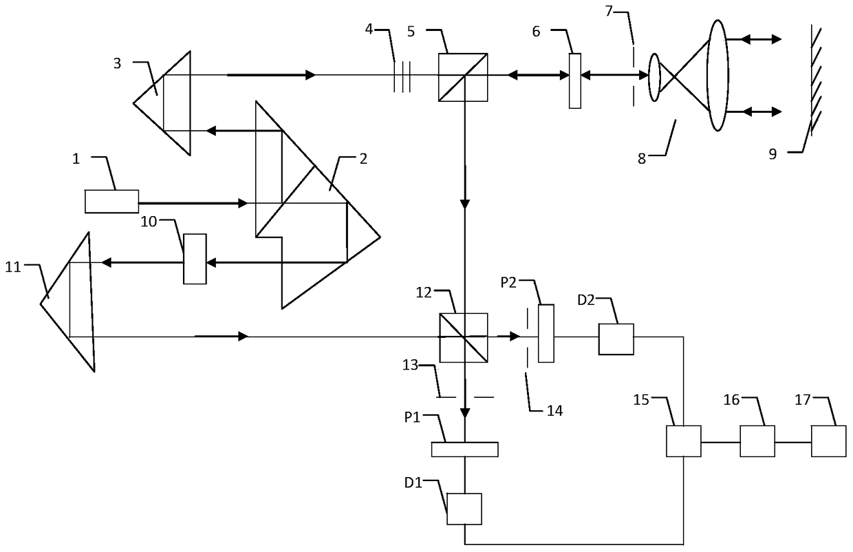 - 项目简介 本发明公开了一种基于声光移频器的收发式一体逆合成孔径激光雷达系统,激光器发射的激光光束经偏振分光器分束,其中一路经第一个角锥棱镜、光纤光栅、第一个分光棱镜、1/4波片、第一个光阑、望远系统照射到目标上后反射回来到达第一个分光棱镜反射到第二个分光棱镜上分成两路光;另一路经声光移频器、第二个角锥棱镜、第二个分光棱镜后分成两路光与前一路光束都分成的两路分别经第二光阑、第三光阑、检偏器,光电探测器和检偏器,光电探测器后产生的两个电信号经前置放大器、混频器、信号处理器后对所得信号进行处理。本发明是收发一体的整体设计,提高了信噪比;且提高了分辨率。