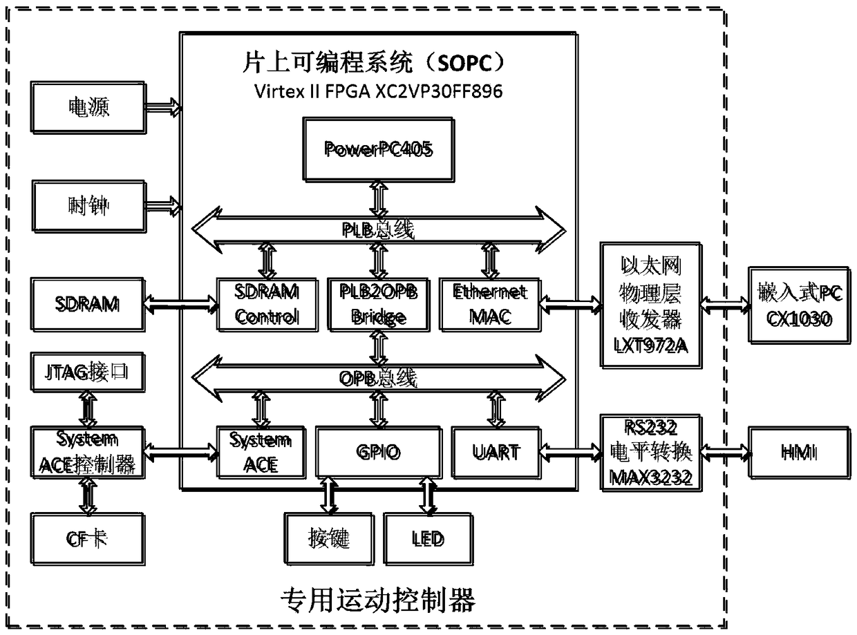 - 项目简介 本发明涉及一种用于四索牵引摄像机器人的专用运动控制器。其主要由基于Virtex II系列现场可编程逻辑门阵列的可编程片上系统及其外围电路构成。FPGA片内SOPC功能模块根据四索牵引摄像机器人运动控制要求进行定制,主要包括硬核微处理器PowerPC405、处理器局部总线PLB、片上外设总线OPB、PLB转OPB桥、SDRAM控制器、以太网媒介访问控制器、UART、GPIO及系统级高级配置环境,所述的片内功能模块之间均逻辑连接;外围电路主要由电源、时钟、SDRAM存储器、ACE控制器及CF卡、按键、LED、以太网物理层收发器LXT972A、RS232电平转换器MAX3232组成,所述的外围电路均与FPGA电连接。采用SOPC技术实现运动控制器优化了系统的硬件组成,同时增强了系统的柔性。