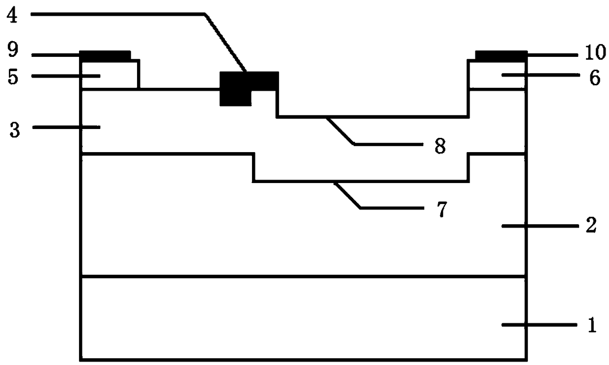 - 项目简介 本发明公开了一种具有部分下沉沟道的4H‑SiC金属半导体场效应晶体管,其自下而上包括4H‑SiC半绝缘衬底、P型缓冲层、N型沟道层,N型沟道层表面设有源极帽层和漏极帽层,源极帽层和漏极帽层表面分别设有源电极和漏电极,N型沟道层上方且靠近源级帽层一侧形成栅电极,靠近源级帽层侧的部分栅电极向下凹陷,形成凹栅结构,栅电极与漏极帽层之间形成凹陷栅漏漂移区,P缓冲层上端面靠近漏极帽层处与凹栅漏侧之间形成凹陷栅漏缓冲层,凹陷栅漏漂移区的凹陷深度与凹陷栅漏缓冲层的凹陷深度相同。本发明具有漏极输出电流大、击穿电压高、频率特性优良的优点。