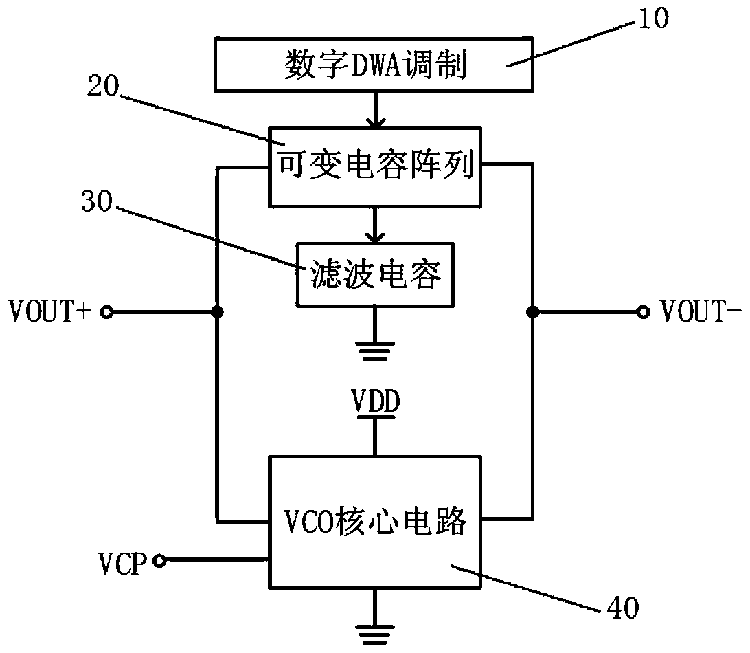 - 项目简介 本发明涉及一种快速频率稳定压控振荡器,包括并联连接的VCO电路模块和可变电容阵列,VCO电路模块和可变电容阵列的并联连接接点分别连接压控振荡器的正、负极输出端VOUT+、VOUT‑,VCO电路模块分别与前级电荷泵的信号输出端以及电源电压VDD相连接,可变电容阵列还与调控其运行状态的数字DWA调制模块以及滤波电容相连接。上述技术方案中,通过对压控振荡器中的可变电容阵列使用数据权重平均技术,降低由于工艺、温度和电压变化导致的阵列器件失配噪声,提高频带选择准确度,降低频率微调所需的时钟周期,较之传统无数字校正算法的VCO,具有更短的频率稳定时间。