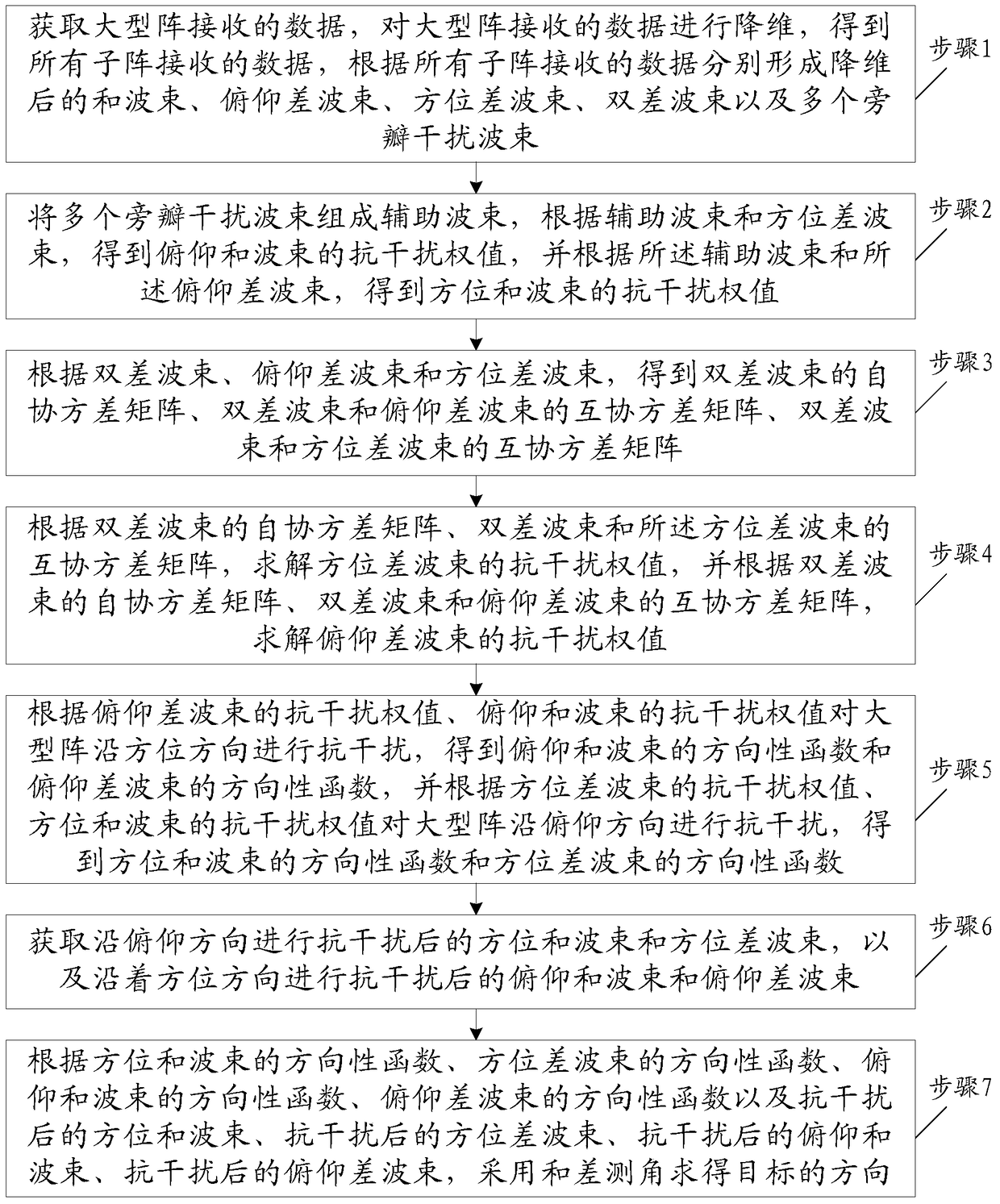 - 项目简介 本发明属于信号处理领域,公开了大型降维四通道抗主副瓣干扰的方法。包括:根据所有子阵接收的数据分别形成降维后的和波束、俯仰差波束、方位差波束、双差波束以及多个旁瓣干扰波束;得到俯仰和波束的抗干扰权值,方位和波束的抗干扰权值;根据双差波束、俯仰差波束和方位差波束,得到双差波束的自协方差矩阵、双差波束和俯仰差波束的互协方差矩阵、双差波束和方位差波束的互协方差矩阵;求解方位差波束的抗干扰权值和俯仰差波束的抗干扰权值;获取沿俯仰方向进行抗干扰后的方位和波束和方位差波束,以及沿着方位方向进行抗干扰后的俯仰和波束和俯仰差波束;采用和差测角求得目标的方向。