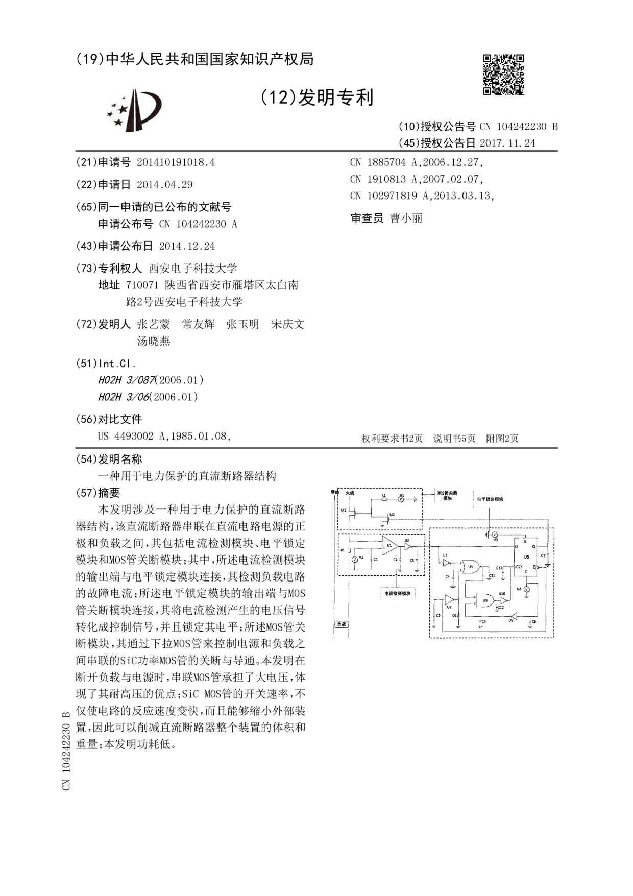 - 项目简介 本发明涉及一种用于电力保护的直流断路器结构,该直流断路器串联在直流电路电源的正极和负载之间,其包括电流检测模块、电平锁定模块和MOS管关断模块;其中,所述电流检测模块的输出端与电平锁定模块连接,其检测负载电路的故障电流;所述电平锁定模块的输出端与MOS管关断模块连接,其将电流检测产生的电压信号转化成控制信号,并且锁定其电平;所述MOS管关断模块,其通过下拉MOS管来控制电源和负载之间串联的SiC功率MOS管的关断与导通。本发明在断开负载与电源时,串联MOS管承担了大电压,体现了其耐高压的优点;SiC?MOS管的开关速率,不仅使电路的反应速度变快,而且能够缩小外部装置,因此可以削减直流断路器整个装置的体积和重量;本发明功耗低。
